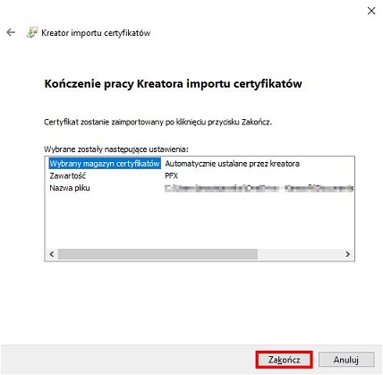 6. Certyfikat zostanie zaimportowany po kliknięciu przycisku Zakończ: