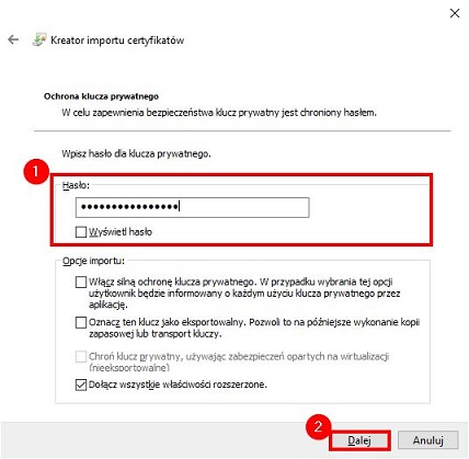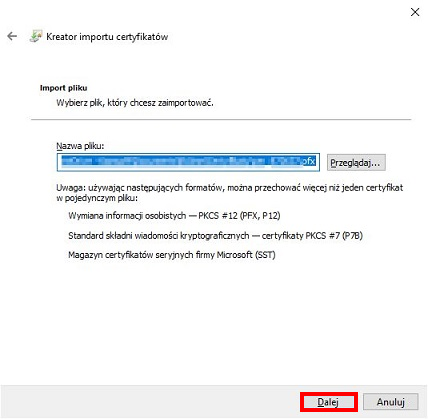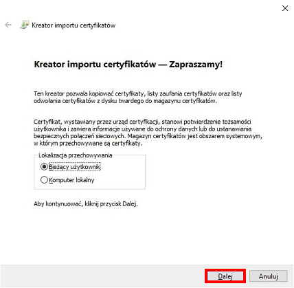 2. Następnie należy na niego dwukrotnie kliknąć - po wykonaniu czynności wyświetlone zostanie Kreator importu certyfikatu. Aby kontynuować proces importu, należy wybrać przycisk Dalej: