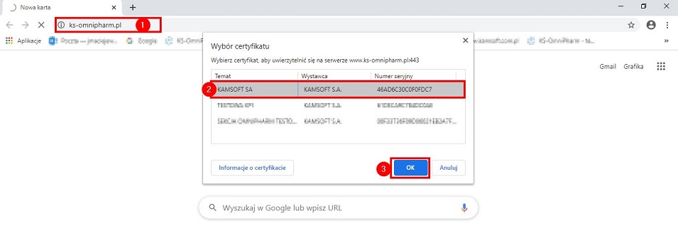 1. Aby zalogować się do systemu KS-OmniPharm, należy wprowadzić adres strony startowej https://www.ks-omnipharm.pl, i wskazać odpowiedni certyfikat – jest to wymagane do uwierzytelnienia dostępu do systemu. Potwierdzenie certyfikatu jest konieczne podczas każdego logowania. Należy zaznaczyć właściwy certyfikat i kliknąć OK (rys. 1).