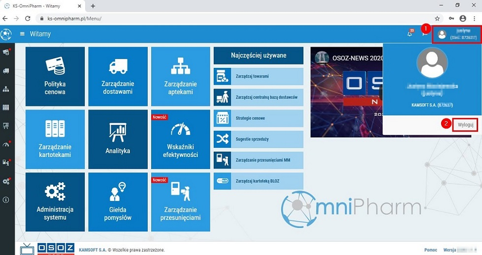 4. Następnie należy wylogować się i zalogować ponownie za pomocą nowego hasła (pamiętając o konieczności potwierdzenia certyfikatu przed zalogowaniem). Aby wylogować się z systemu KS-OmniPharm, należy kliknąć w pole oznaczone ikoną