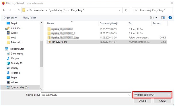 UWAGA! Podczas wybierania pliku zalecane jest zaznaczenie opcji "Wszystkie pliki", w celu uzyskania pewności, że plik z certyfikatem będzie widoczny, np.: