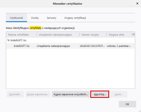 Rys. 3. Menedżer certyfikatów, import certyfikatu