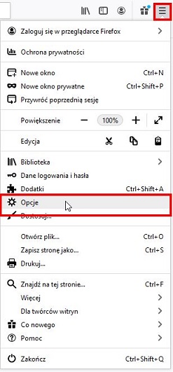 1. Aby zaimportować certyfikat do przeglądarki Mozilla Firefox, należy kliknąć w przycisk menu dostępny w górnej części okna po prawej stronie, a następnie wybrać Opcje:
