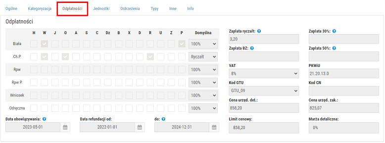 Rys. 5. Przykładowa karta towaru, zakładka "Odpłatności"