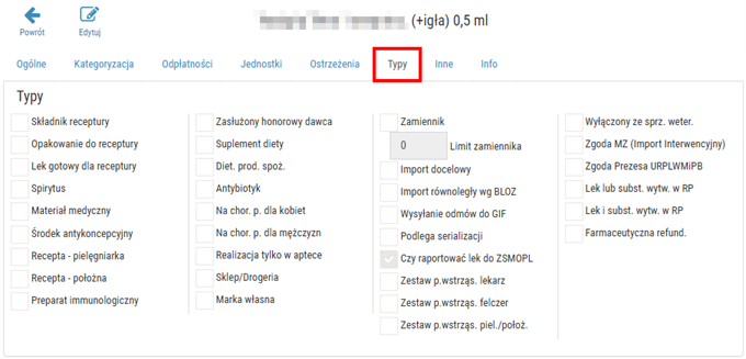 - preparat immunologiczny - określa, czy dany lek jest preparatem immunologicznym, wtedy termin ważności recepty wydłużony do 90 dni,