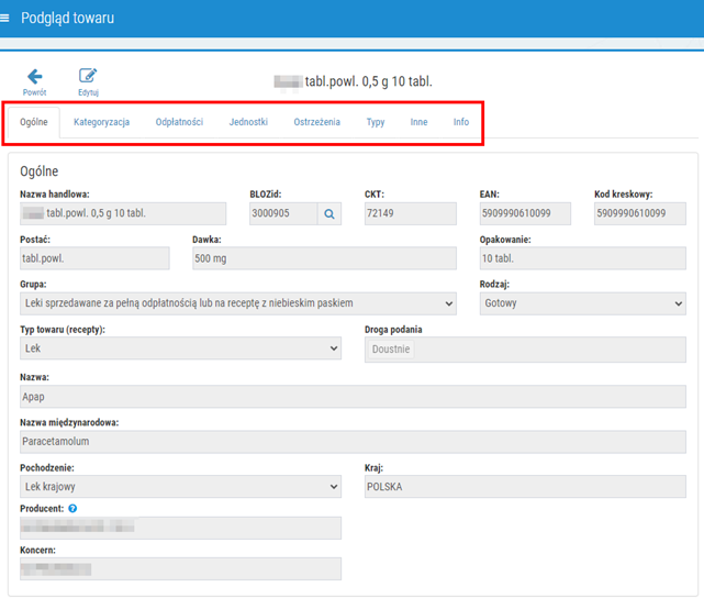 Wyświetlane informacje na karcie towaru są bardzo ważne, ponieważ zapamiętane tu ustawienia mają wpływ na klasyfikację leków podczas sprzedaży przez farmaceutów w aptekach. Domyślnie karta jest wyświetlana w trybie podglądu, aby dokonać zmian na karcie należy wybrać przycisk Edytuj (Edycja karty towaru). Przykładowa karta: