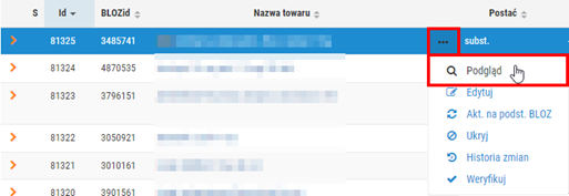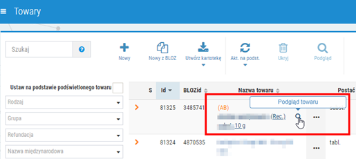 Można również skorzystać z menu podręcznego i funkcji Pogląd (rys. poniżej) lub podświetlić dany towar i wybrać przycisk Podgląd dostępny w górnej części okna: