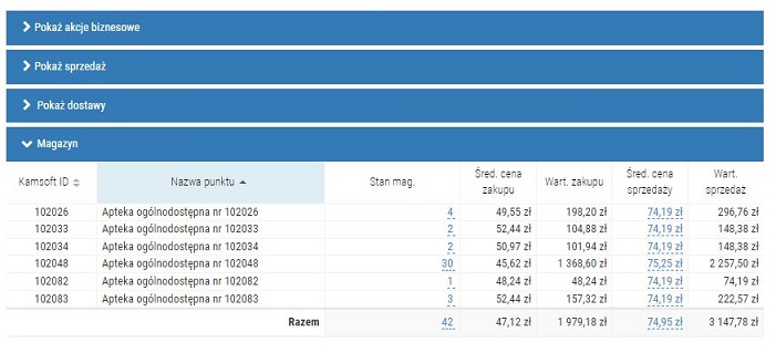 - Pokaż magazyn – podgląd stanów magazynowych danego produktu w poszczególnych aptekach (funkcjonalność jest dostępna dla sieci, które wysyłają dane sprzedażowe), np.: