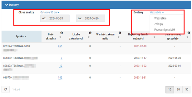 - Pokaż dostawy – podgląd dostaw danego towaru w punktach sprzedaży. Funkcjonalność jest dostępna dla sieci, które wysyłają dane sprzedażowe. Wyświetlone dane można filtrować według okresu analizy (wartość domyślna to Ostatnie 30 dni) oraz źródła dostaw (dzięki opcji można odfiltrować dostawy pochodzące z zakupów lub przesunięć MM), rys. poniżej.