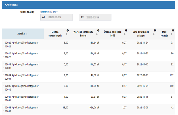- Pokaż sprzedaż – podgląd sprzedaży danego towaru w punktach sprzedaży. Funkcjonalność jest dostępna dla sieci, które wysyłają dane sprzedażowe. Wyświetlone informacje można filtrować według okresu analizy (domyślnie jest to "ostatnie 30 dni").