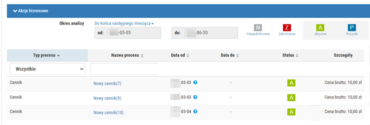 - Pokaż akcje biznesowe – podgląd akcji biznesowych, w których uczestniczy dany towar. Domyślnie wyświetlane są wszystkie akcje biznesowe, jednak listę można przeszukiwać według wybranego procesu, klikając w pole edycyjne "Wszystkie". Oprócz tego możliwe jest filtrowanie według dat obowiązywania (w tym celu należy kliknąć w pole "data od", "data do").