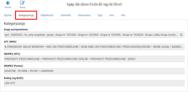 2. Kategoryzacja – w zakładce widoczne są informacje dotyczące przynależności towaru do poszczególnych kategorii oraz grup towarowych: