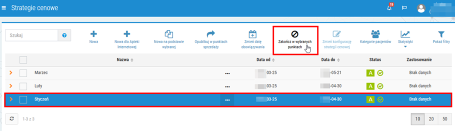 Rys. 1. Opcja umożliwiająca zakończenie zaznaczonych strategii cenowych w wybranych aptekach