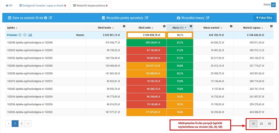 - W dolnej części okna można określić, czy na stronie raportu ma się znajdować maksymalnie 10, 20 czy 50 pozycji, aptek (wystarczy kliknąć na odpowiedni przycisk