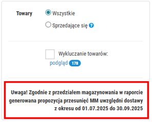 UWAGA! Przesunięcia MM wygenerowane z poziomu raportu KPI PREMIUM TOP 3000 towarów z dostawami od 3 do 6 miesięcy będą obejmować wskazane towary, lecz uwzględnione zostaną dostawy wyłącznie z przedziału magazynowania od 3 do 6 miesięcy (zgodnie z założeniami raportu). Dokładny zakres dat będzie widoczny w oknie parametryzowania generowanych przesunięć MM, przykładowo:
