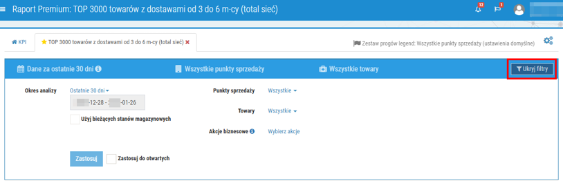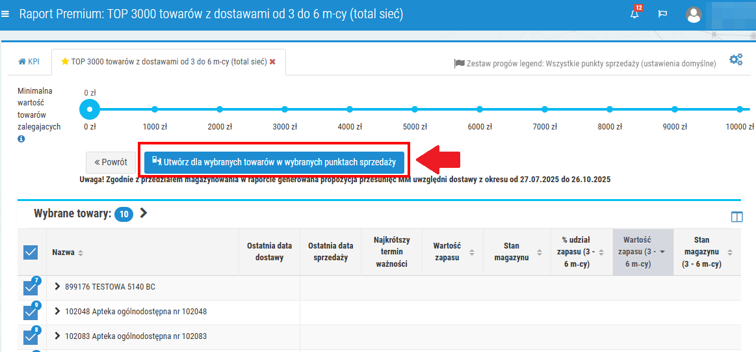 Poniżej zaprezentowany został przykład utworzenia propozycji przesunięcia międzymagazynowego z poziomu raportu Top 3000 towarów z dostawami od 3 do 6 miesięcy (total sieć) który prezentuje listę towarów z dostawami od 3 do 6 miesięcy w skali całej sieci (dane aktualne na ostatni dzień wybranego okresu analizy). W przypadku takiej listy produktów można rozważyć wykonanie przesunięcia międzymagazynowego, ponieważ być może w sieci istnieją apteki, które wykazują zapotrzebowanie na dany towar. Akcję można wykonać bezpośrednio z poziomu KPI PREMIUM.