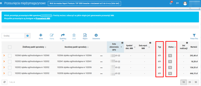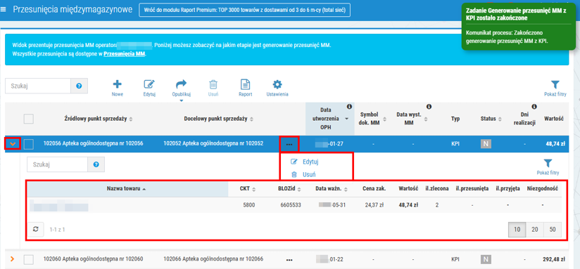 9. Podczas generowania propozycji przesunięć MM w górnej części okna może pojawić się pasek informujący o etapach procesu (pasek znika natychmiast po wykonaniu akcji, dlatego nie zawsze jest widoczny dla użytkownika). Propozycje przesunięć MM zostaną wyświetlone ze statusem Nieopublikowane, Typ: KPI (rys. poniżej). Tak utworzone pozycje użytkownik może edytować, wysłać do aptek lub usunąć.