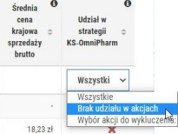 2. Otrzymaną listę towarów warto przejrzeć i zweryfikować pod kątem uczestnictwa w aktywnej lub przyszłej akcji biznesowej (kolumna Udział w strategii KS-OmniPharm). Dzięki opcjom filtrowania można np. ukryć w raporcie towary, które biorą już udział w strategiach KS-OmniPharm. W tym celu należy wybrać przycisk Pokaż filtry, następnie kliknąć w pole Wszystkie (znajdujące się pod nagłówkiem kolumny Udział w strategii KS-OmniPharm) i z rozwijanej listy wskazać opcję Brak udziału w akcjach. Po wykonaniu czynności na liście wyświetlone zostaną tylko te pozycje, które nie biorą udziału w akcjach biznesowych wysterowanych z poziomu systemu KS-OmniPharm (takie pozycje oznaczone są ikoną