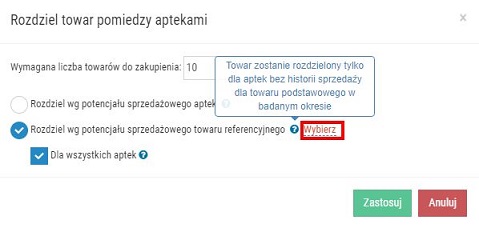 Aby osiągnąć wyżej wymieniony cel, należy wybrać opcję Rozdziel wg potencjału sprzedażowego towaru referencyjnego. W wyniku zastosowania funkcji dodatkowa ilość towaru do zakupienia jest rozdzielana w oparciu o potencjał sprzedażowy towaru referencyjnego (wskazanego przez użytkownika) w badanym okresie. Zatem po wybraniu opcji należy wskazać towar referencyjny, klikając Wybierz (rys. 3). Dodatkowa ilość towaru zostanie rozdzielona do aptek na podstawie potencjału sprzedażowego towaru referencyjnego. Użytkownik decyduje czy wyliczone ilości zostaną rozdzielone wyłącznie do punktów sprzedaży bez historii sprzedaży dla towaru z zamówienia, czy dla wszystkich aptek (czyli również tych z historią sprzedaży) poprzez zaznaczenie/odznaczenie pola Dla wszystkich aptek.