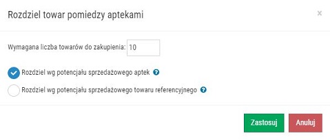 Opcja "Rozdziel towar pomiędzy aptekami"
