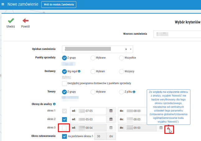 - Brak sprzedaży w okresie 1, 2, 3 – wyjątkiem Nowość zostaną oznaczone pozycje zamówienia, których suma sprzedaży ze wskazanych okresów jest mniejsza od 1. Jeżeli w kreatorze zamówienia dany okres sprzedażowy zostanie odznaczony, to tym samym zostanie wyłączony z analizy i wyjątek Nowość nie będzie weryfikowany dla tego okresu sprzedażowego. Wówczas w kreatorze zamówienia pojawi się odpowiedni komunikat (przykład na rys. poniżej).