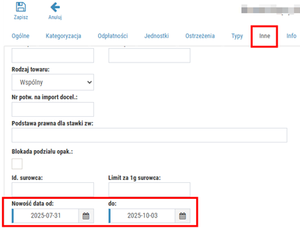 Rys. 8. Miejsce na karcie towaru, gdzie można uzupełnić zakres obowiązywania nowości