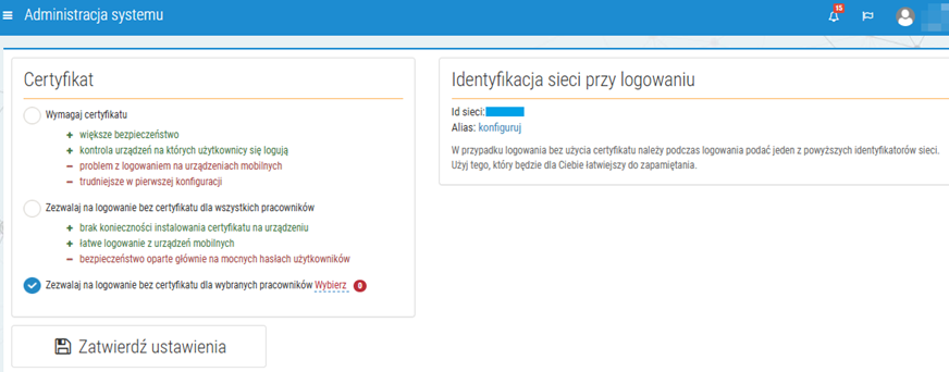 Przy każdej pozycji wyszczególnione są zalety oraz minusy rozwiązania. W przypadku wybrania logowania bez użycia certyfikatu podczas logowania wymagane będzie podanie identyfikatora sieci: id sieci (6-cyfrowy numer sieci) lub alias (zalecane jest wybranie opcji, która będzie dla użytkownika łatwiejsza do zapamiętania, rys. poniżej). Jeżeli użytkownik zdecyduje się na wprowadzanie podczas logowania aliasu zamiast Kamsoft id sieci, to należy pamiętać, że raz zdefiniowany alias zostanie na stałe powiązany z identyfikatorem sieci, nie będzie możliwości jego zmiany. Aby skonfigurować alias, należy wybrać przycisk konfiguruj. Po zaznaczeniu odpowiedniej opcji, należy zapisać zmiany za pomocą przycisku Zatwierdź ustawienia.