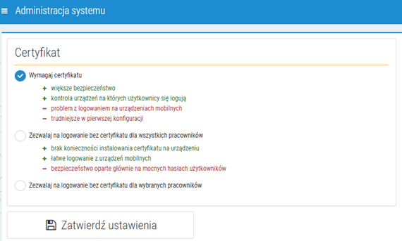 - Zezwalaj na logowania bez certyfikatu dla wszystkich pracowników – instalacja certyfikatu nie jest wymagana, jednak bezpieczeństwo jest oparte jedynie na mocnych hasłach użytkowników.