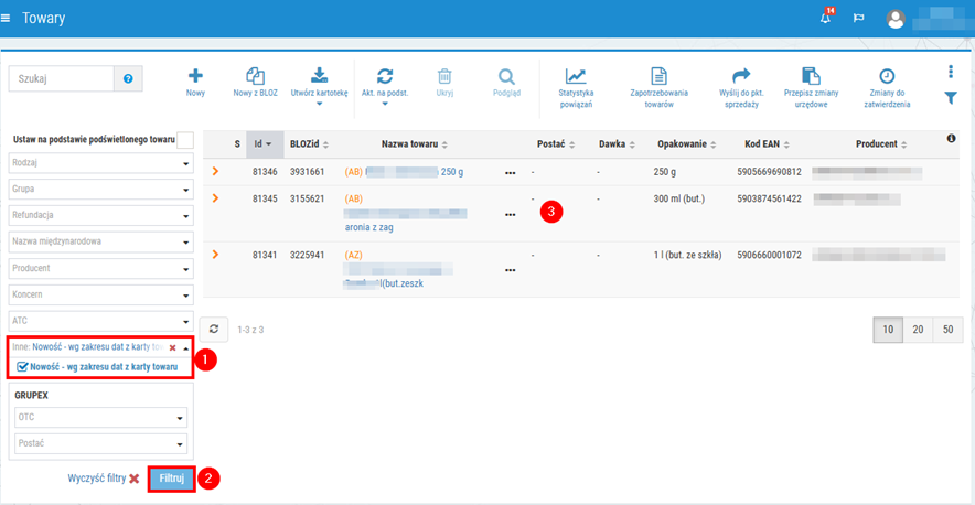 3. Aby przefiltrować listę towarów według wprowadzonych kryteriów, należy kliknąć Filtruj: