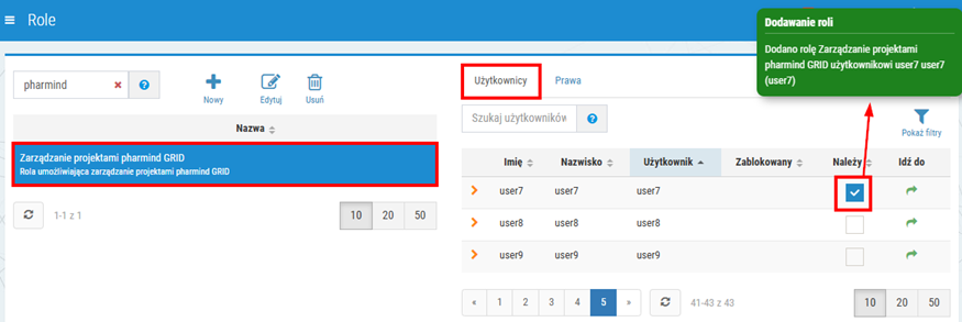 Rys. 2. Nadanie uprawnień do zarządzania projektami pharmind GRID