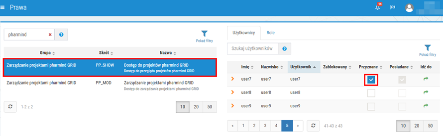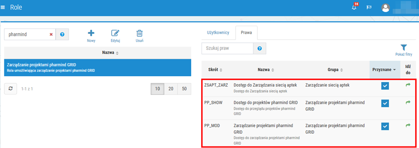 2. Nadanie uprawnień do zarządzania/przeglądu projektów pharmind GRID z poziomu KS-OmniPharm