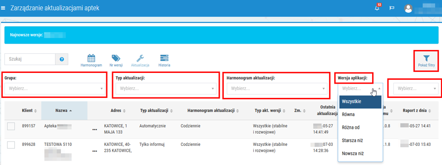 - typ aktualizacji - filtruje listę aptek według ustalonego typu aktualizacji,