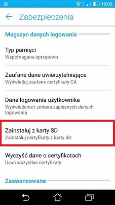 - Następnie w sekcji „Magazyn danych logowania”, należy wybrać „Zainstaluj z karty SD”, np.: