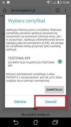- Raporty KPI można przeglądać nie tylko w komputerze, ale również w telefonie czy tablecie. W tym celu należy wcześniej zapisać na danym urządzeniu certyfikat KS-OmniPharm (ten sam certyfikat, za pomocą którego użytkownik uwierzytelnia swój dostęp do systemu KS-OmniPharm podczas logowania). Jak zainstalować certyfikat? Poniżej przedstawiona została kolejność działań (przykład instalacji certyfikatu w telefonie posiadającym system operacyjny Android):