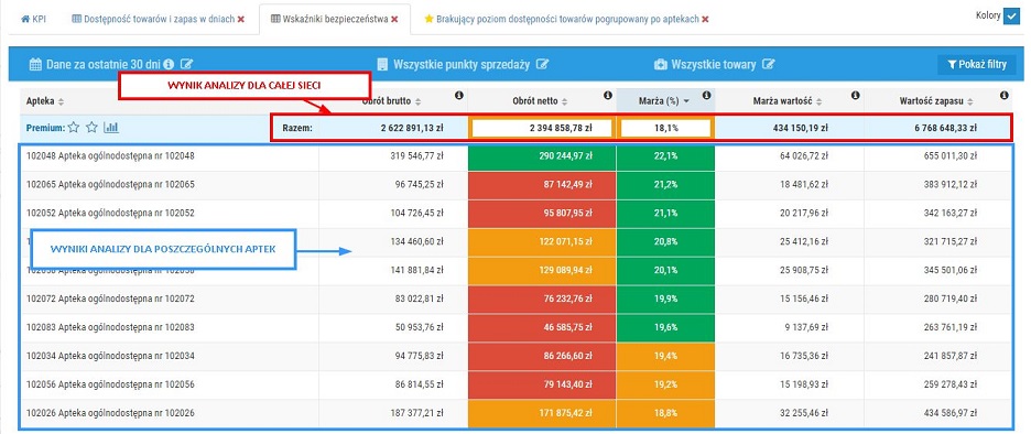 - Każdy raport poziomu KPI Basic standardowo zawiera zestawienie wyników dla poszczególnych aptek oraz wynik dla całej sieci (pole „Razem”/ TOTAL):