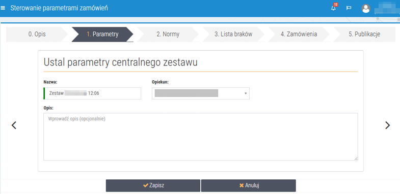 2. Krok pierwszy: ustalenie parametrów centralnego zestawu. W tym miejscu można uzupełnić nazwę, opiekuna (pola są domyślnie uzupełnienie, ale można je edytować) oraz dodatkowy opis:
