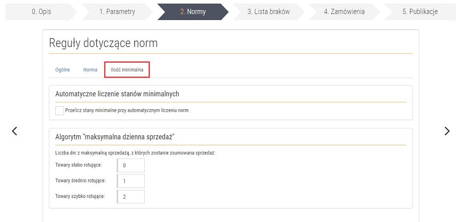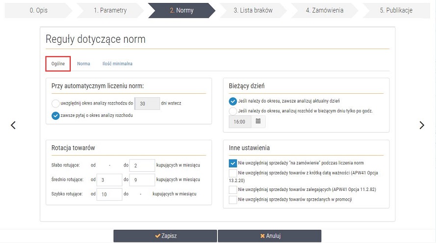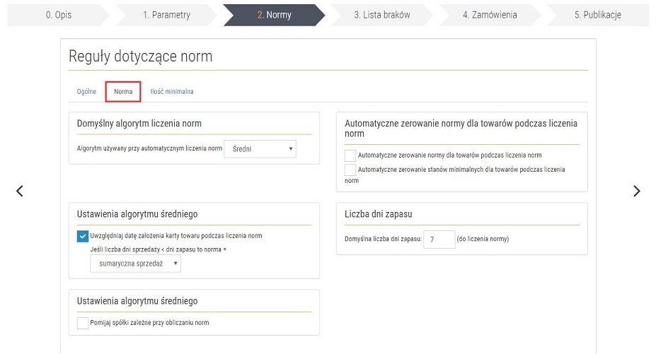 3. Krok drugi: konfiguracja norm. W zakładce 2. Normy można ustalić parametry, na podstawie których będą generowane normy magazynowe: