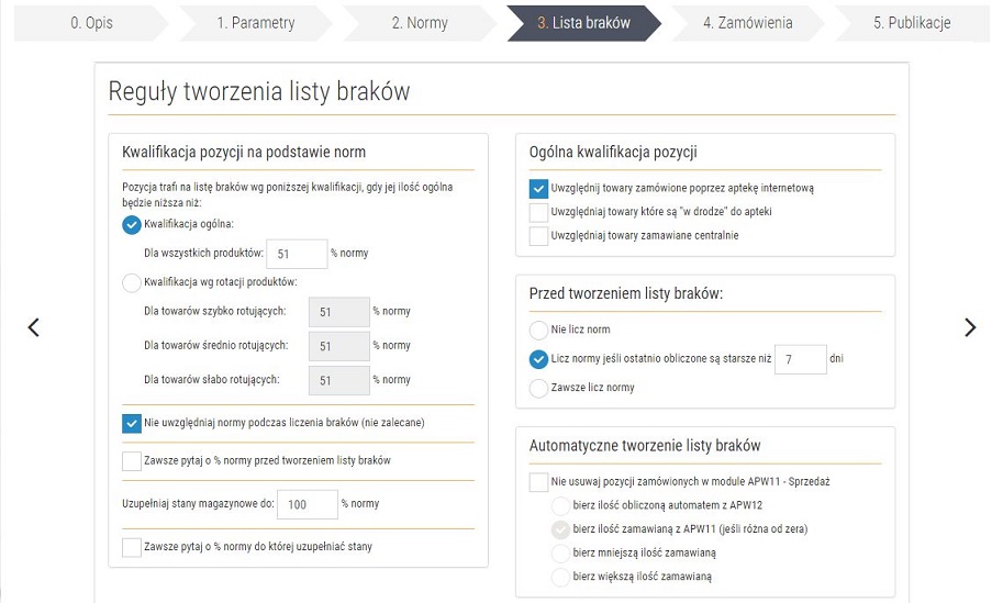 W tym miejscu można sprecyzować reguły, na podstawie których tworzona będzie lista braków. Dostępne opcje: