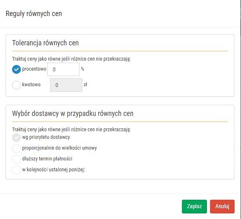 - Reguły równych cen – możliwość określenia warunków dla równych cen (pole Wybór dostawcy w przypadku równych cen jest niedostępne z poziomu centrali).