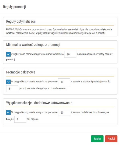 - Pomijanie reguł przyporządkowania – możliwość określenia czy optymalizator ma analizować korzyści płynące z pominięcia jakiejś reguły związanej z przyporządkowaniem do konkretnego dostawcy (reguły przyporządkowania: 1-4).