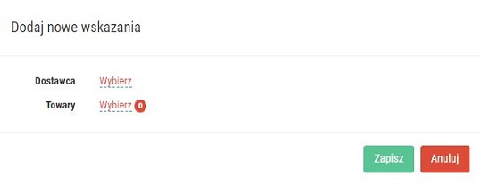 - 2. Wskazania: Towar -> Dostawca – w tym miejscu można wskazać produkty, które mają być zamawiane u konkretnego dostawcy. Po wybraniu przycisku Dodaj wyświetlone zostanie okno, w którym należy wskazać towar i dostawcę: