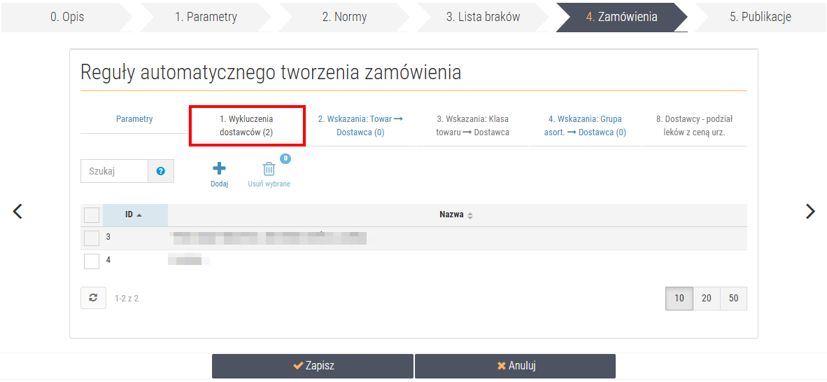 - 1. Wykluczenia dostawców – w tym miejscu można dodać dostawców nieuwzględnianych podczas zamawiania. Listę można również pozostawić pustą (wówczas po stronie apteki będzie możliwa edycja tej opcji). Aby dodać dostawcę, należy wybrać Dodaj, zaznaczyć pole wyboru przy wybranej pozycji i zapisać zmiany. Po dodaniu dostawcy wykluczonego, w nawiasie (przy nazwie zakładki) pojawi się liczba dodanych pozycji.