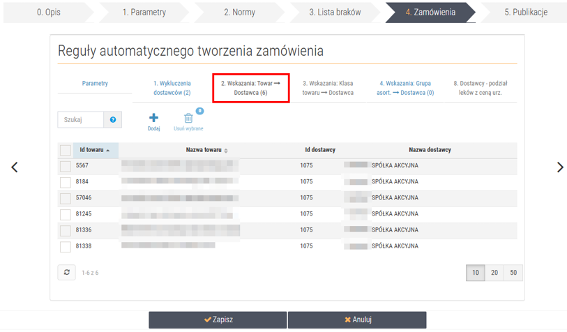 Po kliknięciu Wybierz, przy polu Dostawca wyświetlona zostanie Centralna Baza Dostawców. Należy zaznaczyć wybraną pozycję (kliknąć Wybierz), a następnie w ten sam sposób wskazać towary. Po przyporządkowaniu dostawcy do towarów, należy zapisać zmiany – przycisk Zapisz. Po zapisaniu dodane pozycje pojawią na liście. W ten sposób można dodać dowolną ilość przyporządkowań do listy.