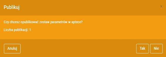 7. Po zapisaniu wyświetlony zostanie komunikat (rys. poniżej), aby wysłać zestaw parametrów do wskazanych aptek, należy wybrać Tak. Jeżeli w oknie publikacji użytkownik wybierze Nie, to zestaw nie zostanie wysłany, lecz jedynie zapisany ze statusem Oczekuje na wysłanie. Takie zestawienie można w każdej chwili edytować i opublikować.