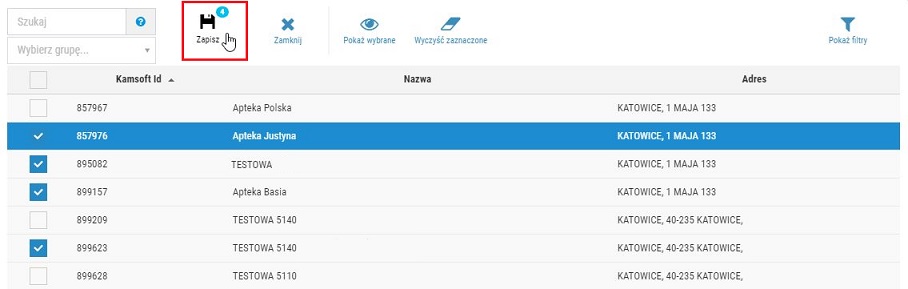 6. Jeżeli utworzony zestaw ma zostać wysłany do punktów sprzedaży, należy przejść do zakładki 5. Publikacje. Po wybraniu przycisku Dodaj wyświetlona zostanie lista aptek, spośród których należy wybrać i zaznaczyć te, do których parametry centralne mają zostać wysłane (można wybrać dowolną ilość). Po zaznaczeniu pól wyboru przy wybranych pozycjach, należy kliknąć Zapisz: