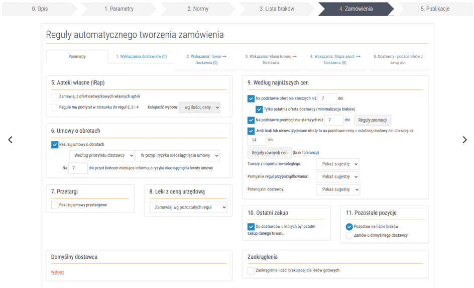 UWAGA! Wszystkie opcje dostępne w oknie kreatora są odzwierciedleniem parametrów, które znajdują się w systemie aptecznym (moduł 12. Zamówienia > Reguły).