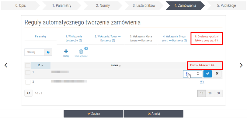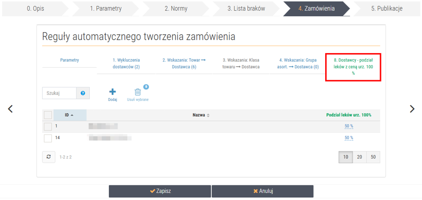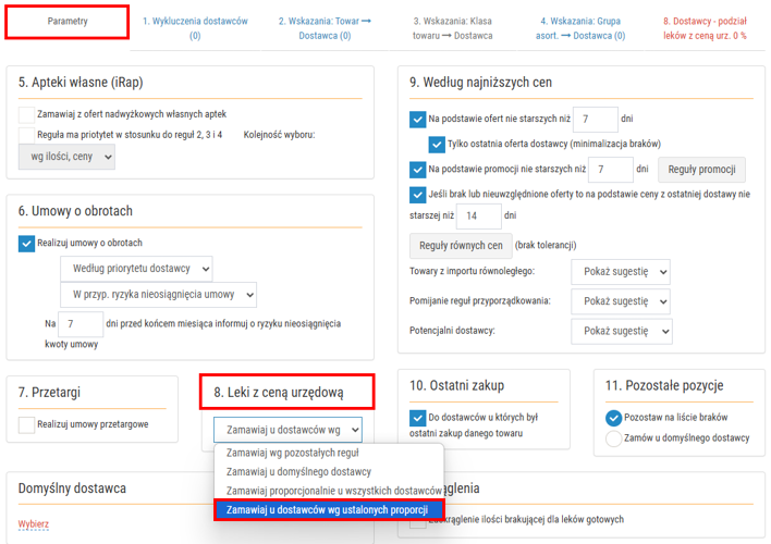 - 8. Dostawcy - podział leków z ceną urz. – w tym miejscu można określić podział leków z ceną urzędową między dostawcami. Funkcja jest aktywna, jeżeli w sekcji Parametry w punkcie 8. Leki z ceną urzędową wybrano opcję Zamawiaj u dostawców wg ustalonych proporcji: