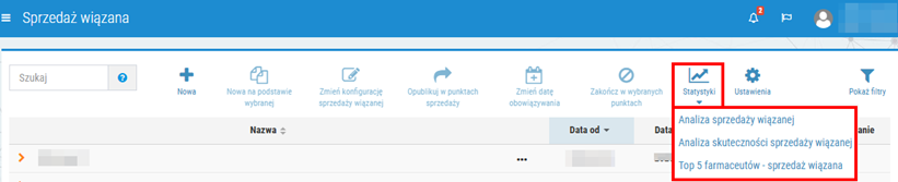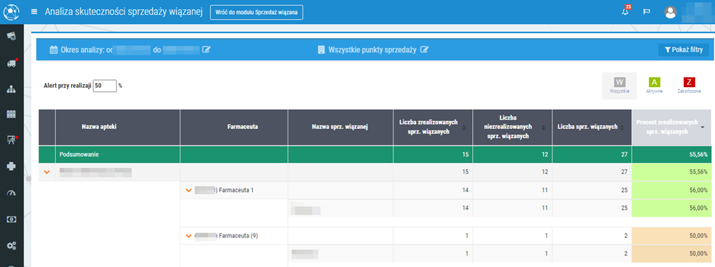 - Top 5 farmaceutów – możliwość zweryfikowania liczby zrealizowanych i niezrealizowanych sprzedaży wiązanych oraz skuteczności realizacji akcji biznesowych w podziale na farmaceutów.
