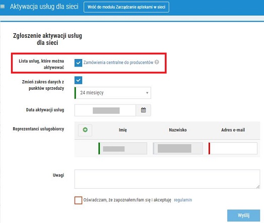 Użytkownik systemu KS-OmniPharm może zgłosić potrzebę aktywacji wybranej usługi dla swojej sieci. W tym celu należy z poziomu modułu Administracja systemu > Zarządzanie aptekami i usługami w sieci wybrać opcję Aktywacja usług (opcja jest dostępna również z poziomu okna Przegląd usług). Następnie wyświetlone zostanie zgłoszenie aktywacji. W górnej części okna widoczna będzie lista usług, które można włączyć (klikając w nazwę danej usługi można wyświetlić instrukcję związaną z daną częścią systemu). Należy zaznaczyć pola wyboru przy wybranych opcjach i uzupełnić formularz zgłoszenia (imię, nazwisko, adres e-mail). Na koniec należy zapoznać się z regulaminem i wysłać zgłoszenie za pomocą przycisku Wyślij.