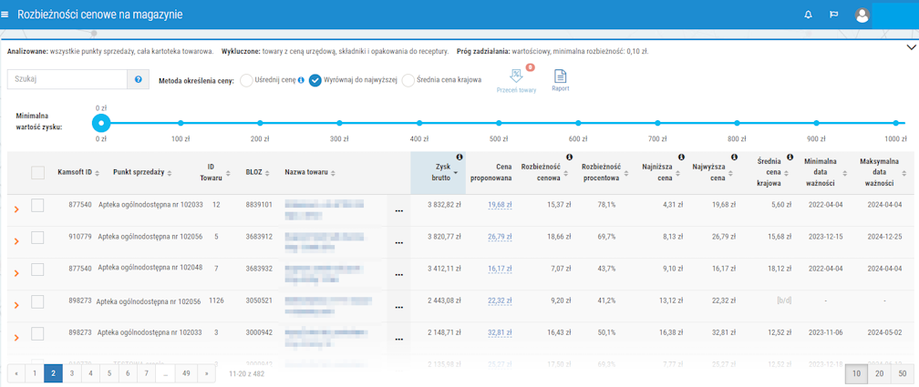 Raport Rozbieżności cenowe na magazynie pozwala na wyłonienie listy towarów, których cena sprzedaży nie jest jednolita w ramach wszystkich dostaw (w aptece znajduje się kilka dostaw tego samego produktu i mają one różną cenę). W takiej sytuacji możliwe jest podniesienie ceny starszych dostaw, w celu zwiększenia na nich marży i tę czynność (przecenę wybranych towarów) można wykonać bezpośrednio z poziomu raportu Rozbieżności cenowe na magazynie. Weryfikacja takich rozbieżności cenowych jest zalecana do cyklicznego wykonywania, ponieważ pozwala to na szybkie wychwycenie niezgodności oraz podjęcie dalszych działań (wykonanie przeceny dostaw).